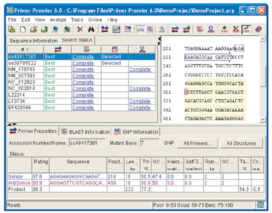 Primer Premier是设计和分析PCR引物的最全面的软件。Primer Premier通过利用最接近的热力学算法和最精确的熔化温度,找到最优的PCR、多重和SNP基因分型引物。引物被筛选的二级结构、二聚体、发夹、同源性和物理性质,然后报告最佳的序列,按顺序排列。